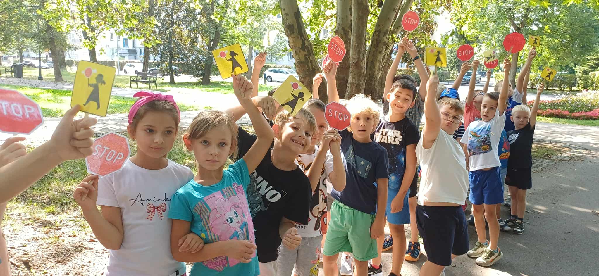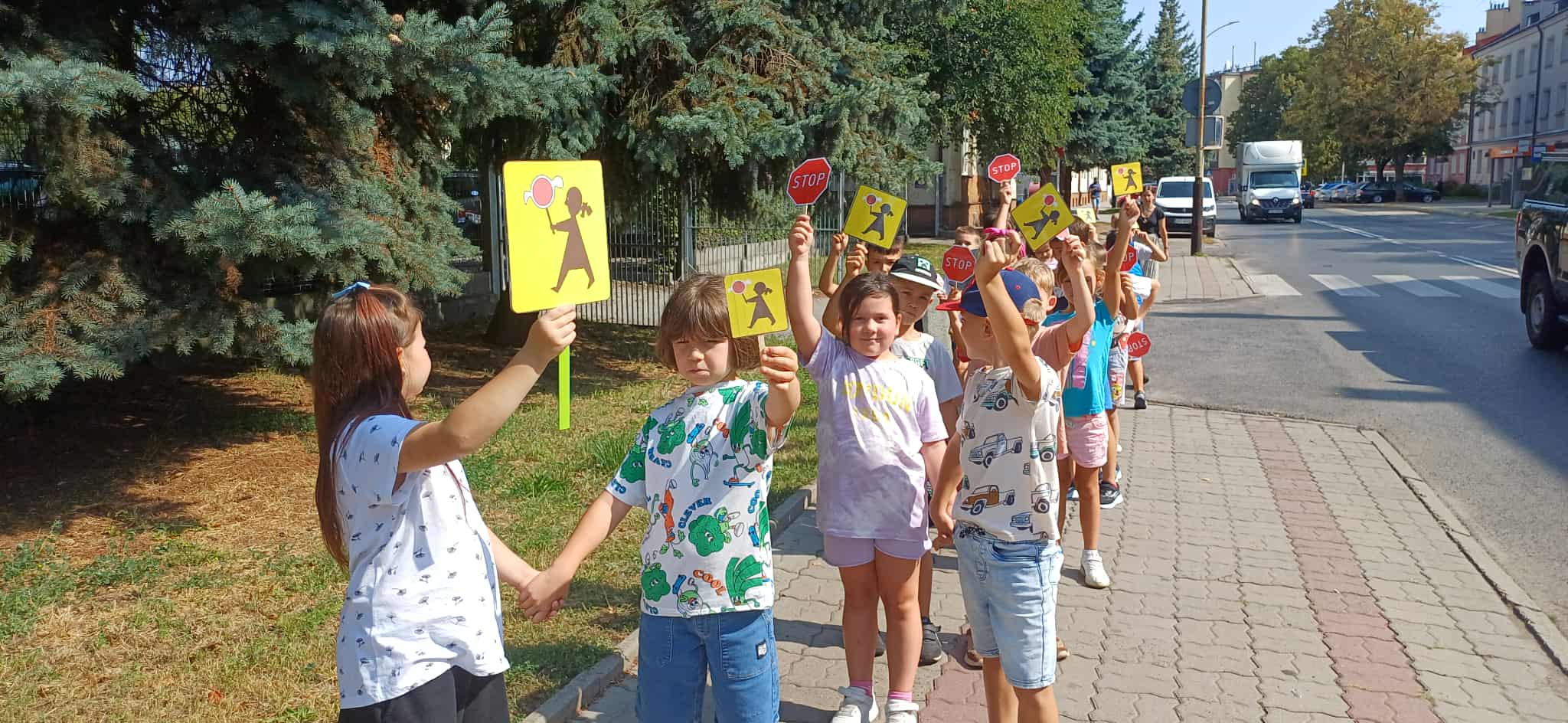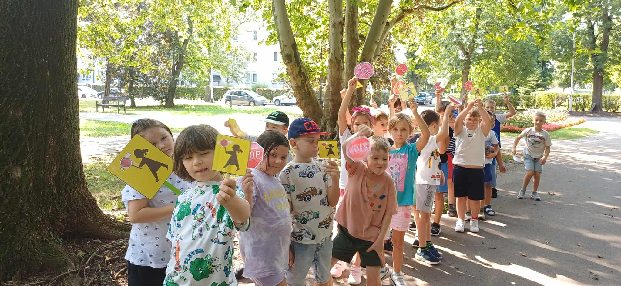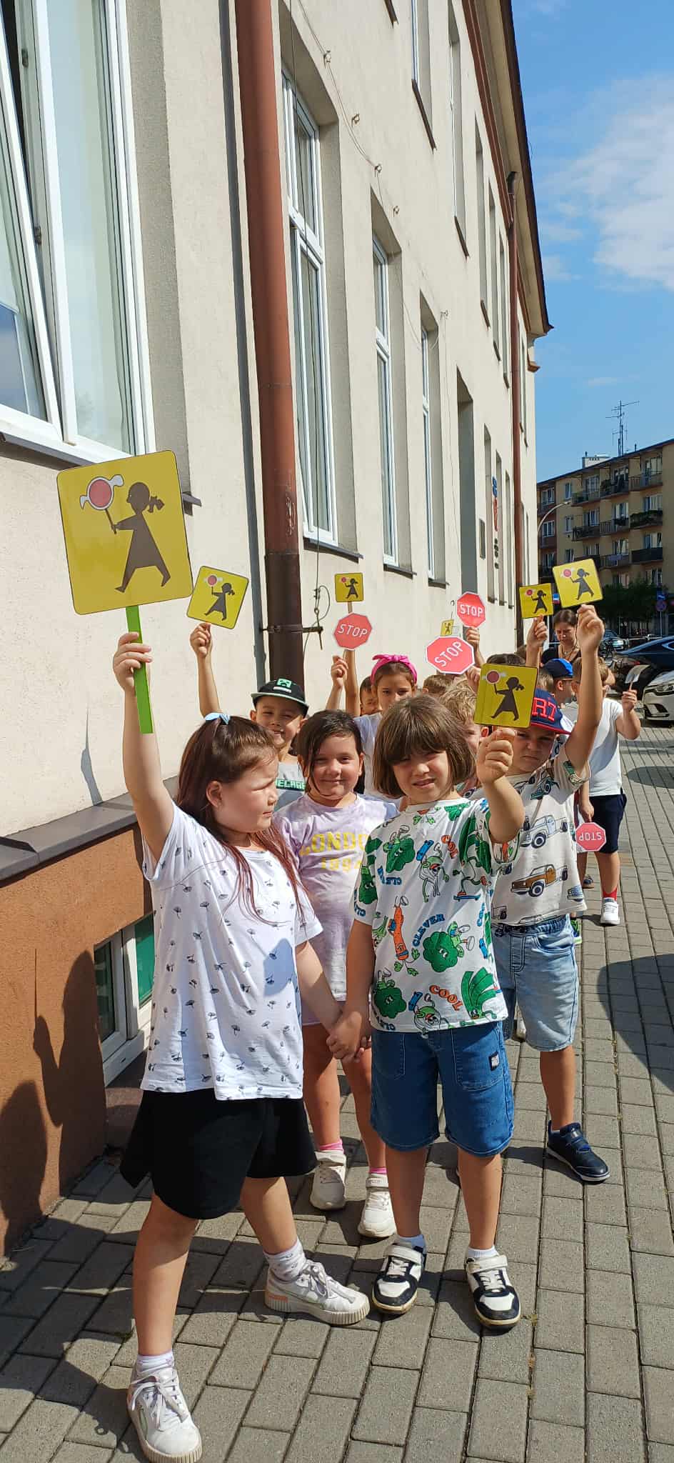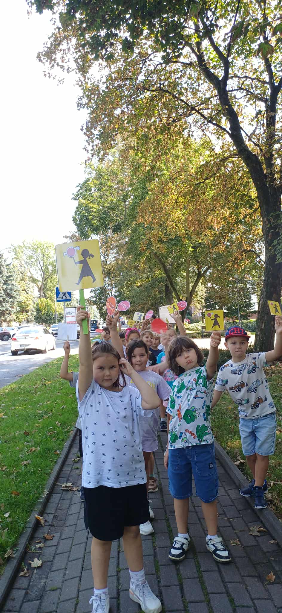 Tym razem temat zajęć dotyczył bezpieczeństwa w ruchu drogowym – niezwykle ważnej umiejętności, którą najmłodsi powinni utrwalać od pierwszych szkolnych lat. Podczas spaceru po najbliższej okolicy dzieci nie tylko powtarzały zasady bezpiecznego poruszania się po drogach, ale również same wcieliły się w rolę małych edukatorów. Trzymając w rękach znaki drogowe, były doskonale widoczne zarówno dla przechodniów, jak i kierowców, zwracając tym samym uwagę na wagę przepisów drogowych. Zajęcia w terenie okazały się świetnym połączeniem nauki i zabawy. Uczniowie z zaangażowaniem utrwalali wiedzę o tym, jak prawidłowo przechodzić przez jezdnię, na co zwracać uwagę przy przejściu dla pieszych oraz dlaczego należy być zawsze czujnym na drodze. Tego dnia najmłodsi nie tylko uczyli się sami, ale również dawali przykład innym, pokazując, że bezpieczeństwo na drodze to sprawa nas wszystkich.