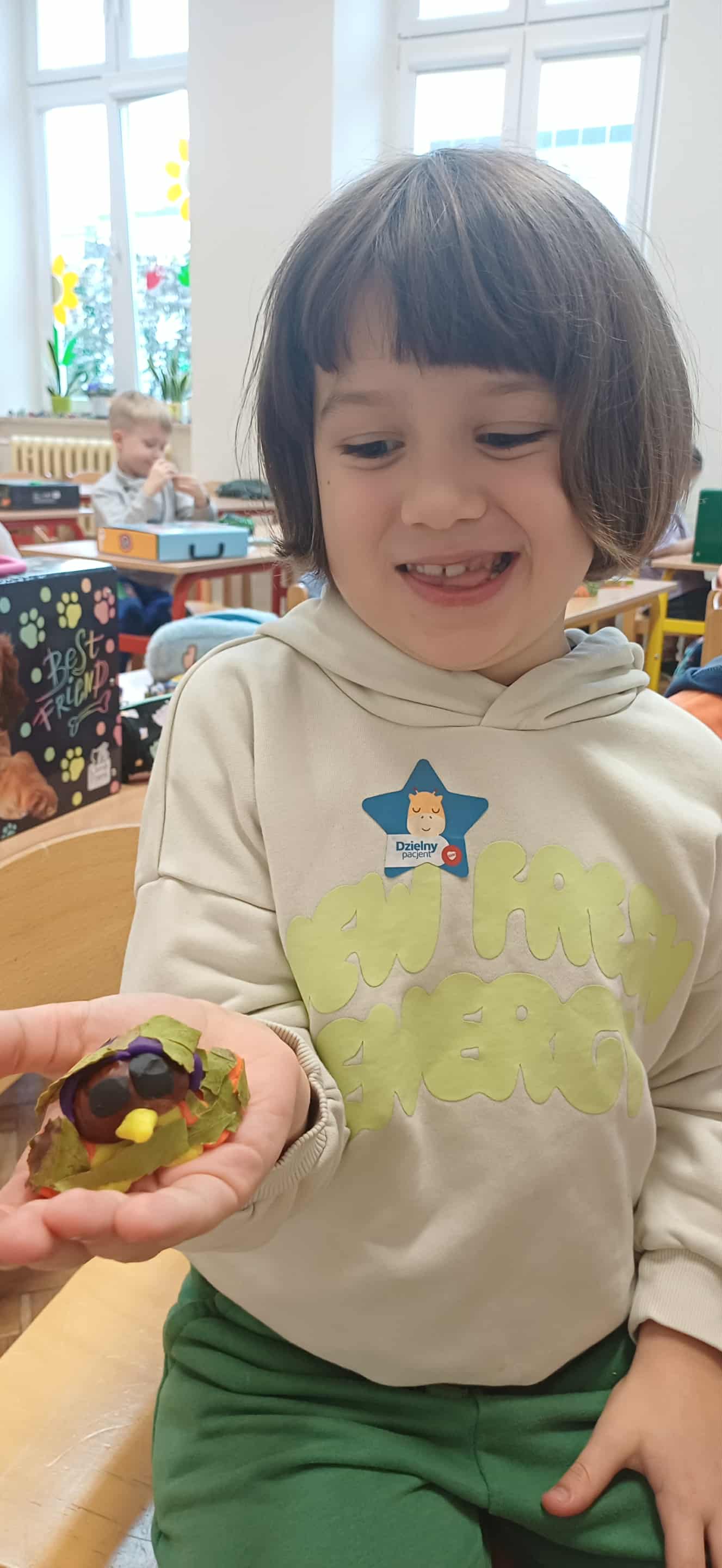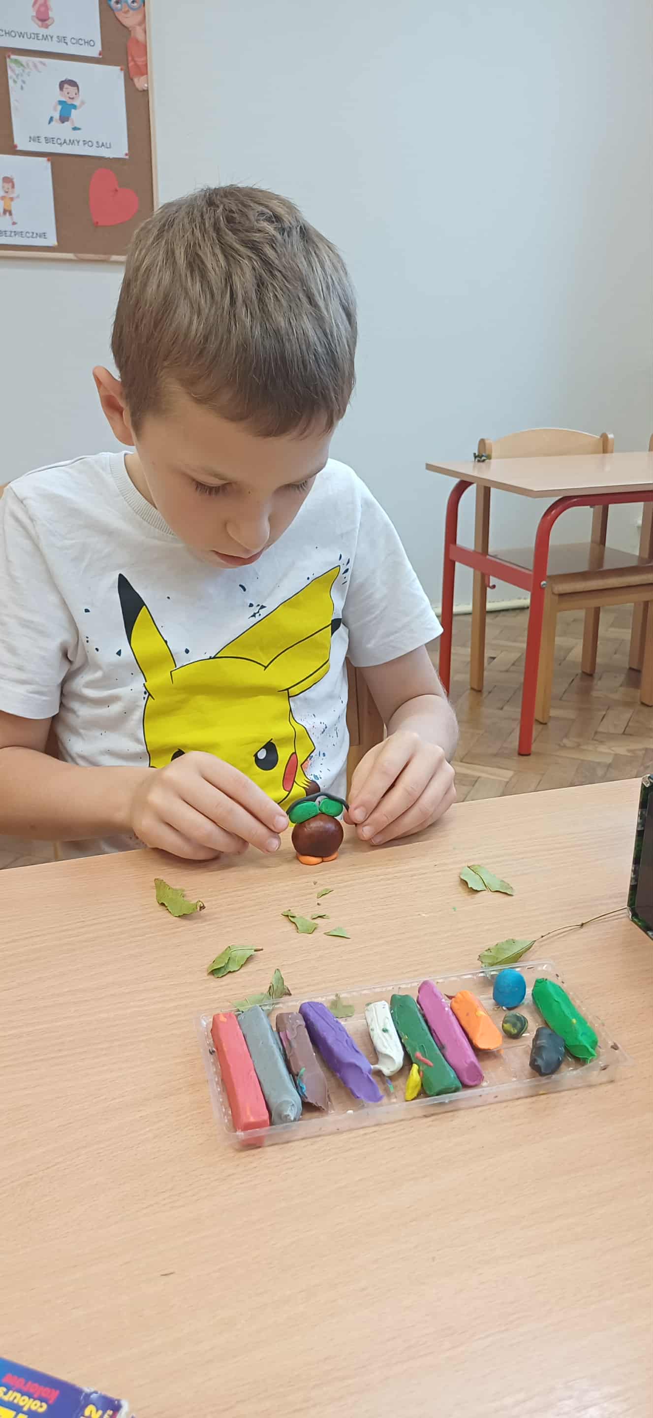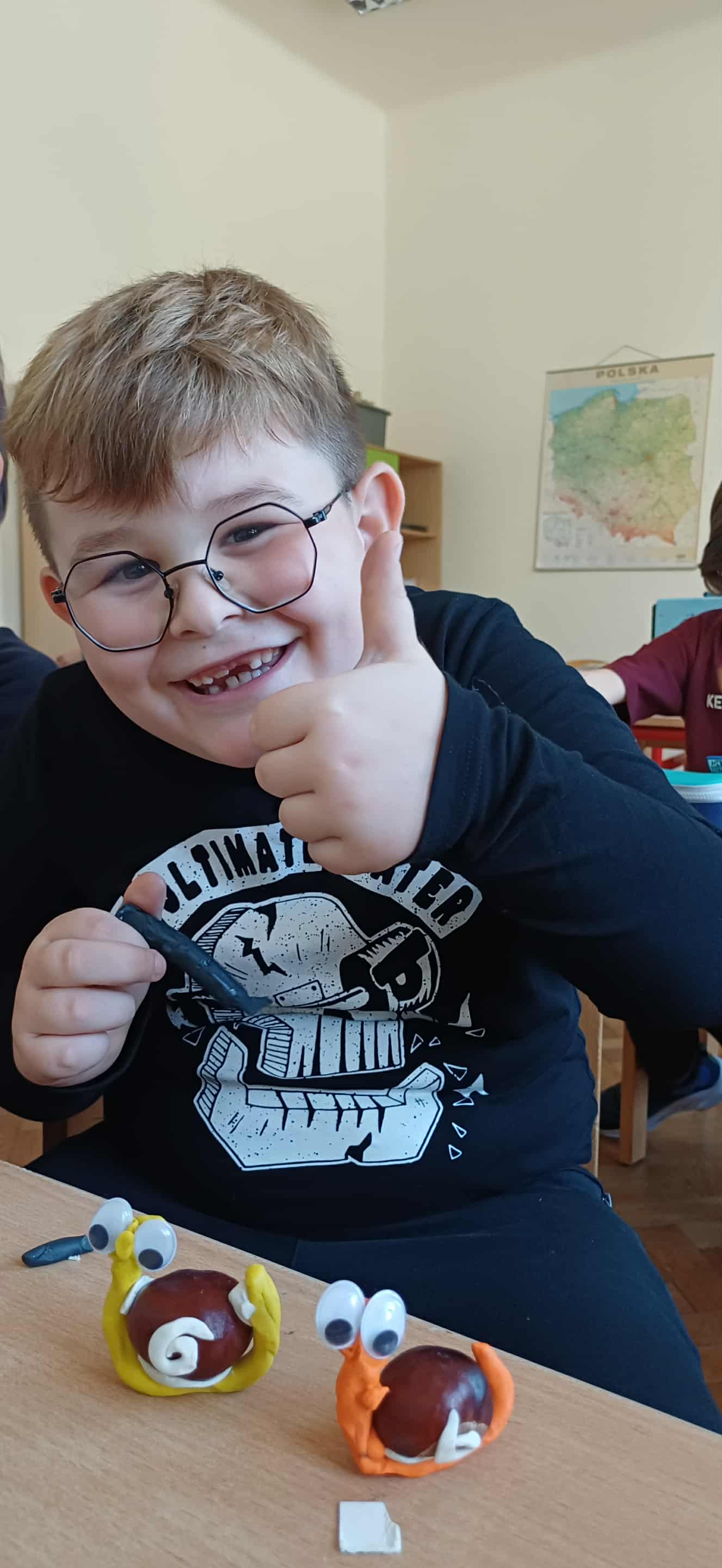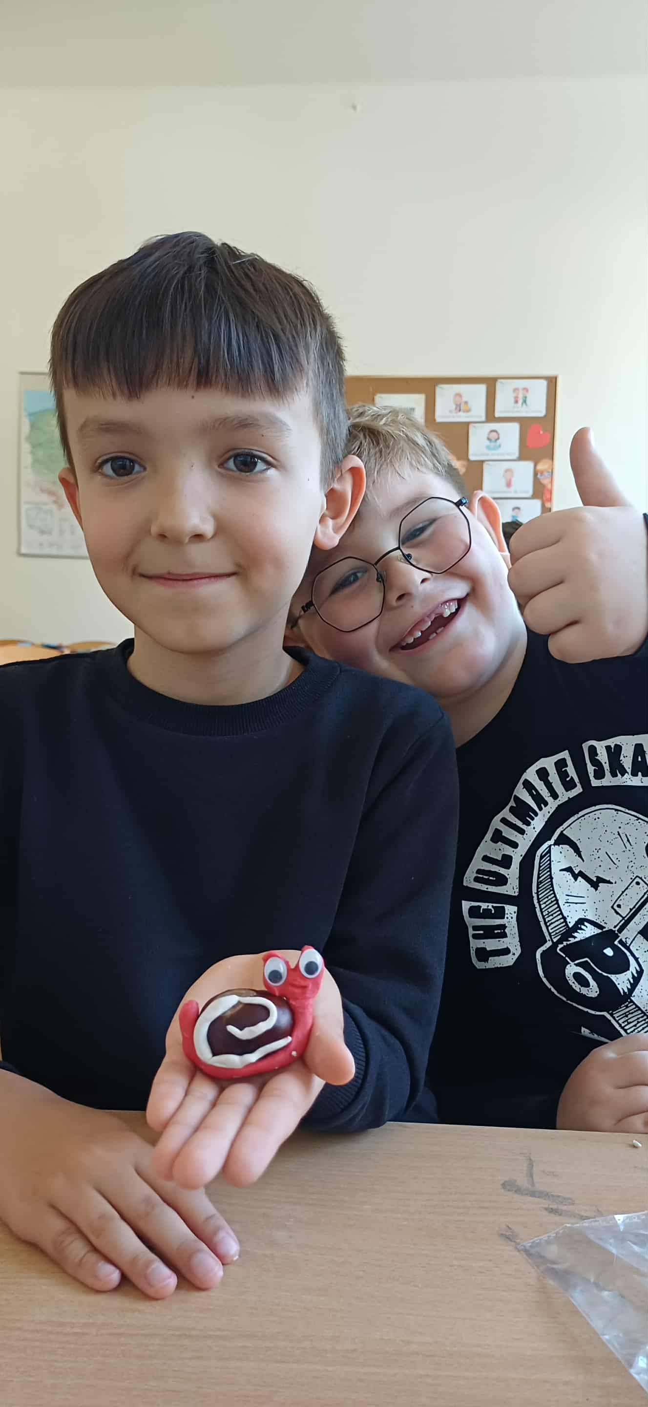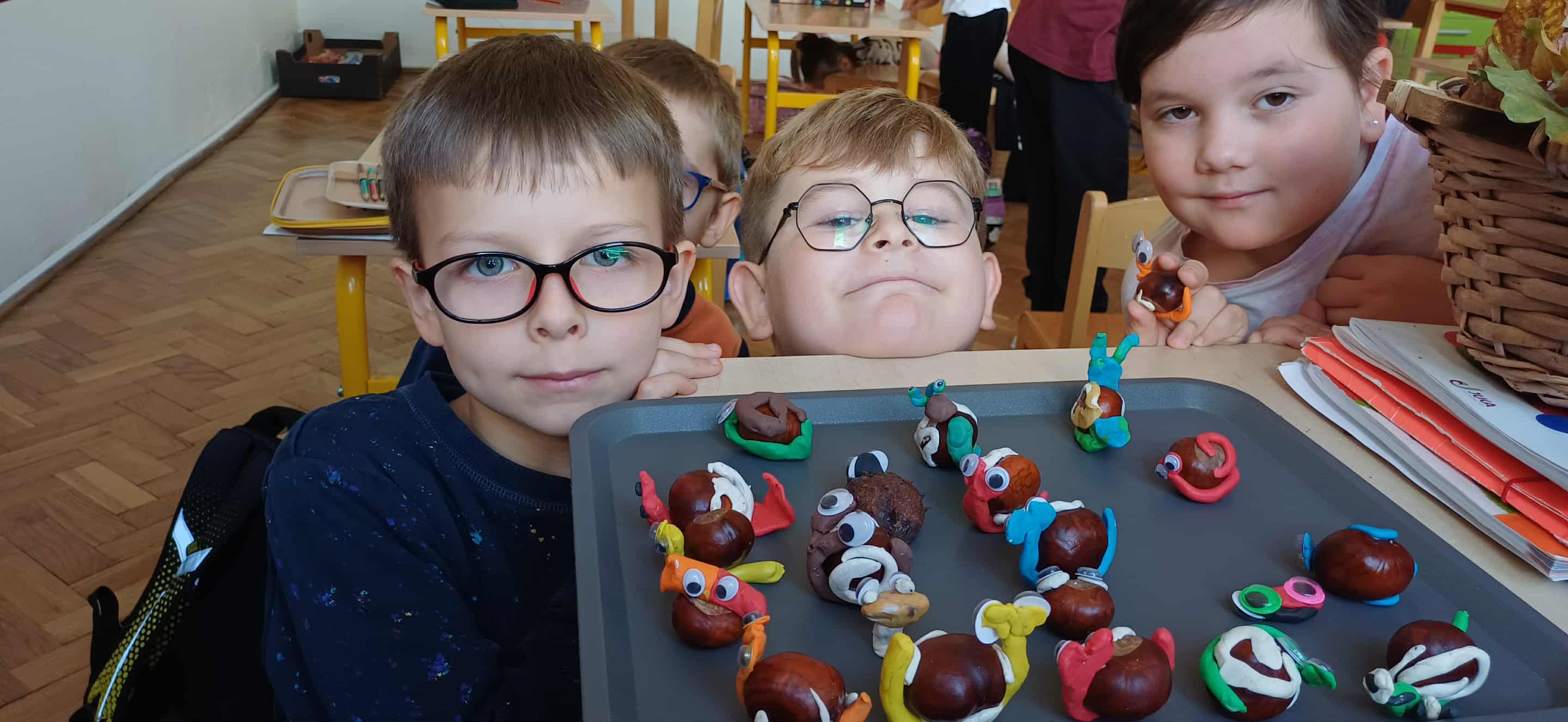 Nasze pierwszaki, zainspirowane zgromadzonymi w kąciku przyrody darami jesieni, z zapałem przystąpiły do jesiennych zabaw plastycznych. Kasztany, żołędzie, listki i patyczki stały się prawdziwą inspiracją do zajęć plastyczno-technicznych. Dzięki kreatywności i cierpliwej pracy uczniów powstały prawdziwe dzieła sztuki – urocze sówki i ślimaczki, które wyglądają, jakby tylko czekały, by ruszyć na spacer po szkolnej ławce. Kto wie, może po dzwonku wyruszą na swoją małą przygodę między zeszytami i piórnikami?