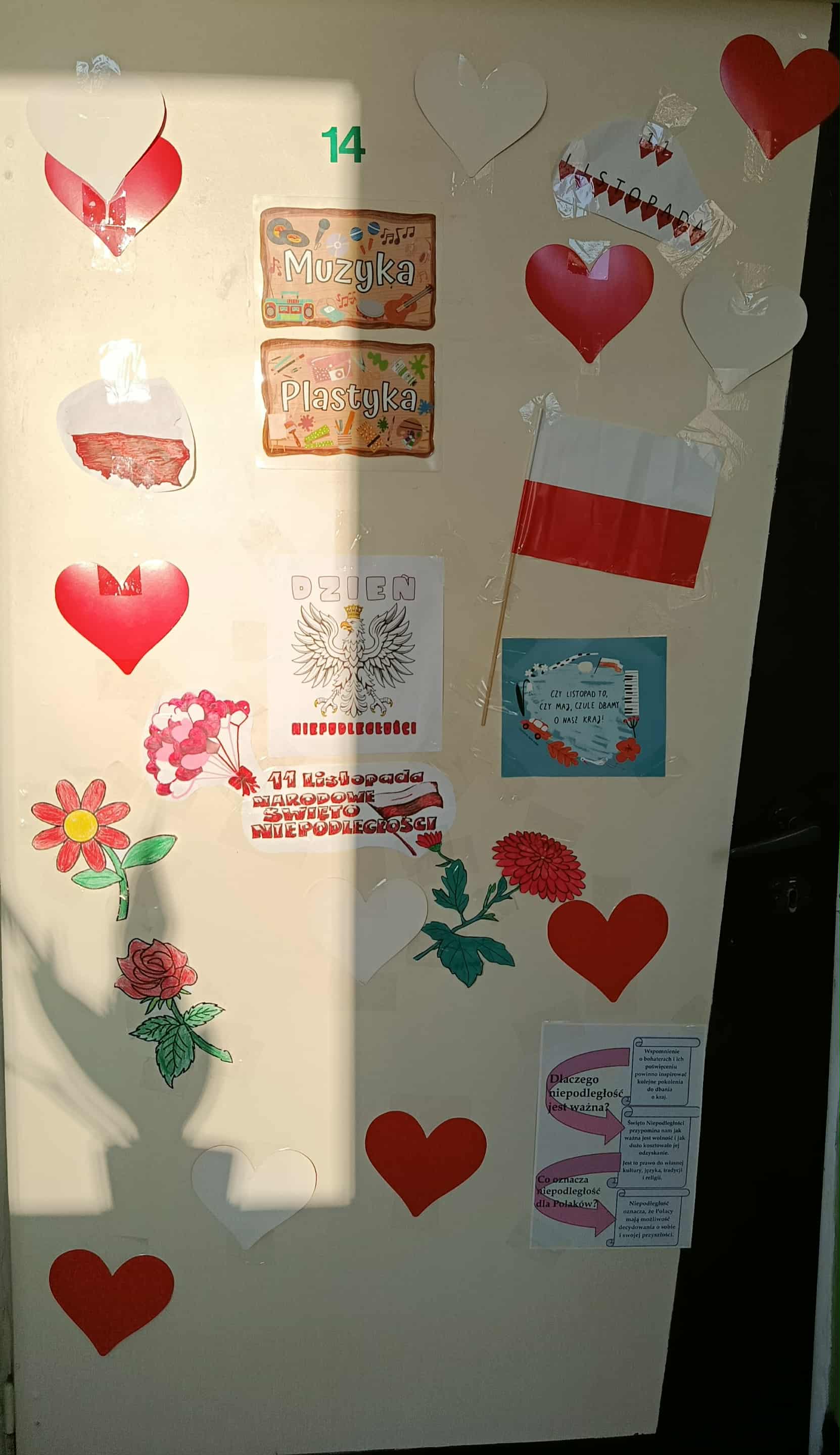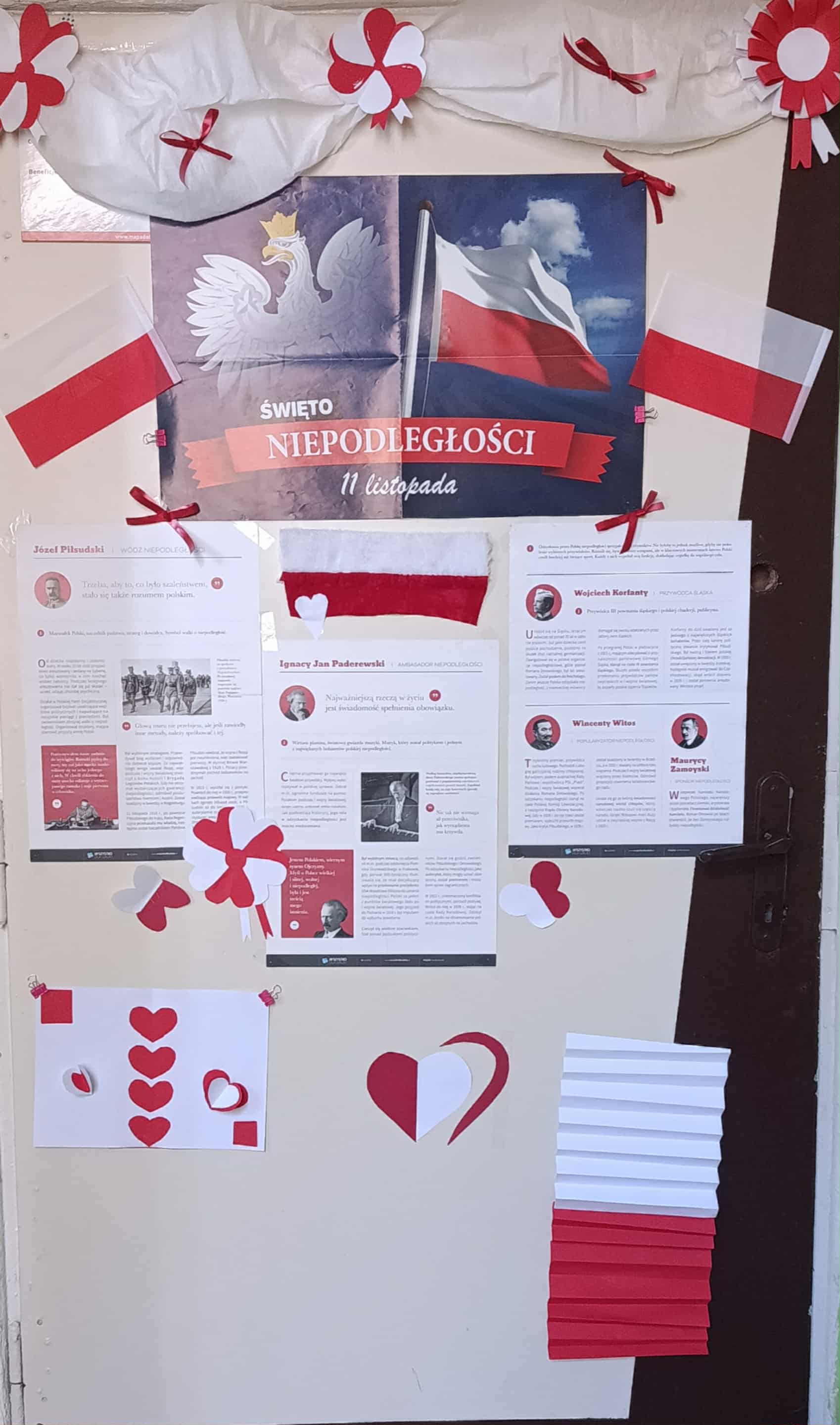 Obchody Narodowego Święta Niepodległości w tym roku rozpoczęliśmy od projektu „Drzwi do niepodległości”. Uczniowie klas od czwartych do ósmych mieli za zadanie ozdobić drzwi swojej sali barwami biało- czerwonymi i postaciami związanymi z odzyskaniem niepodległości. Efekty pracy przeszły najśmielsze oczekiwania.