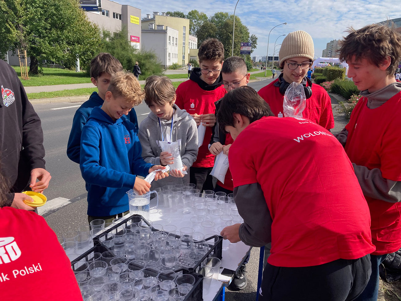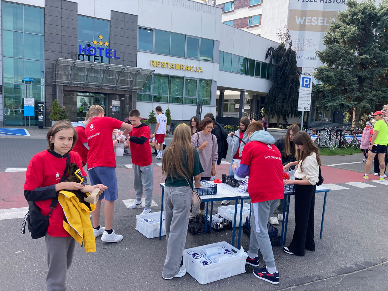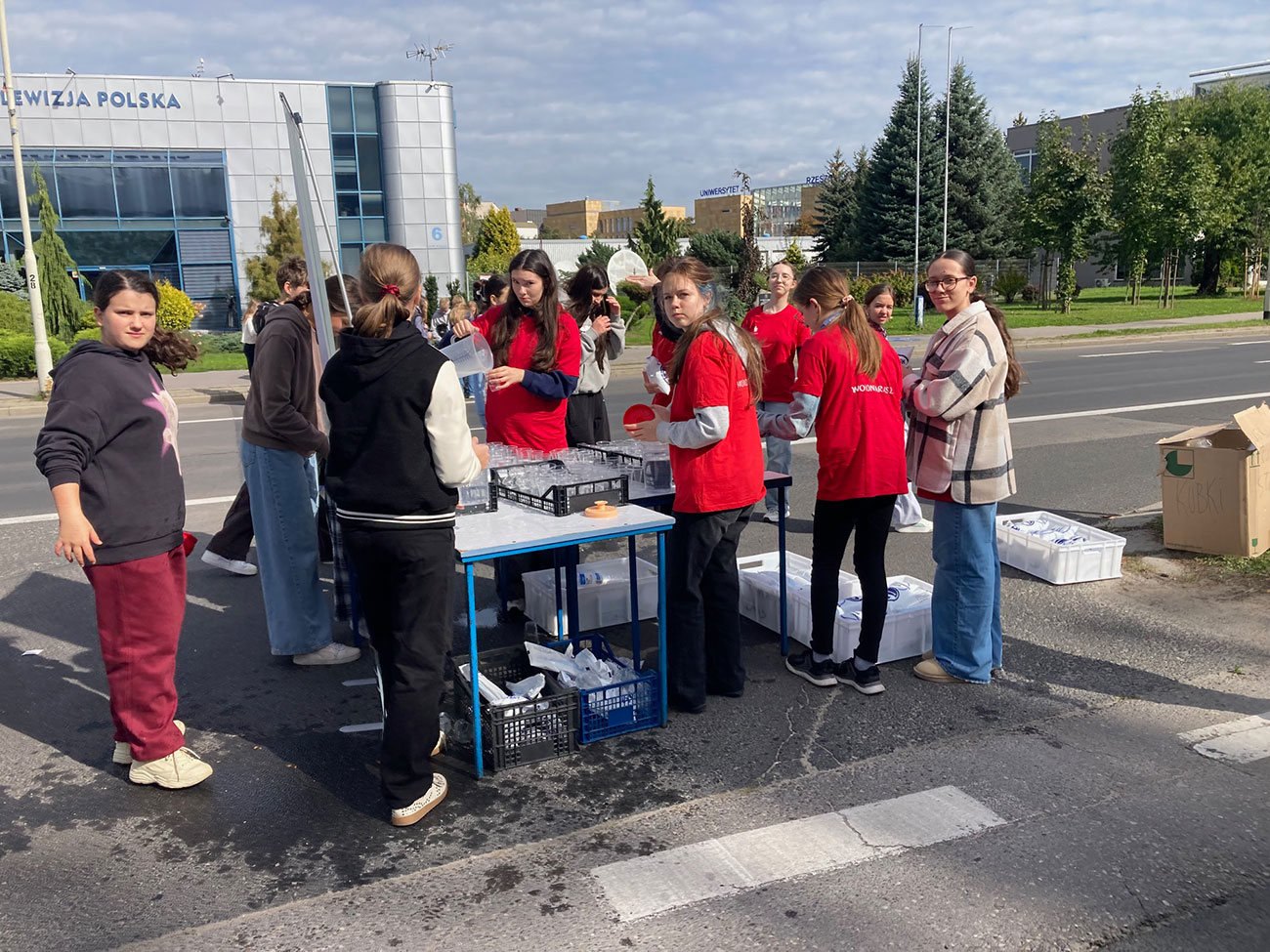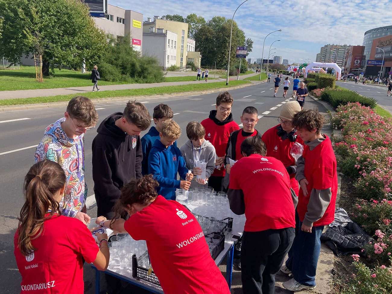 Na trasie głównego biegu 10 i 5 km, nasi uczniowie zagrzewali do sportowej walki, nawadniali biegaczy i sprzątali po dobrze wykonanej pracy. Niektórzy wolontariusze najpierw uczestniczyli we wcześniejszych biegach młodzieżowych, a później pomagali z uśmiechem mimo zmęczenia. Chętnych do pracy zebrała się cała gromada aż 36 wolontariuszy z klas siódmych i ósmych. Dziękujemy za poświęcony wolny czas. Dobrze, że możemy na Was liczyć! Uczniów zorganizowały opiekunki Szkolnego Koła Wolontariatu panie: Agata, Anna i Kasia.