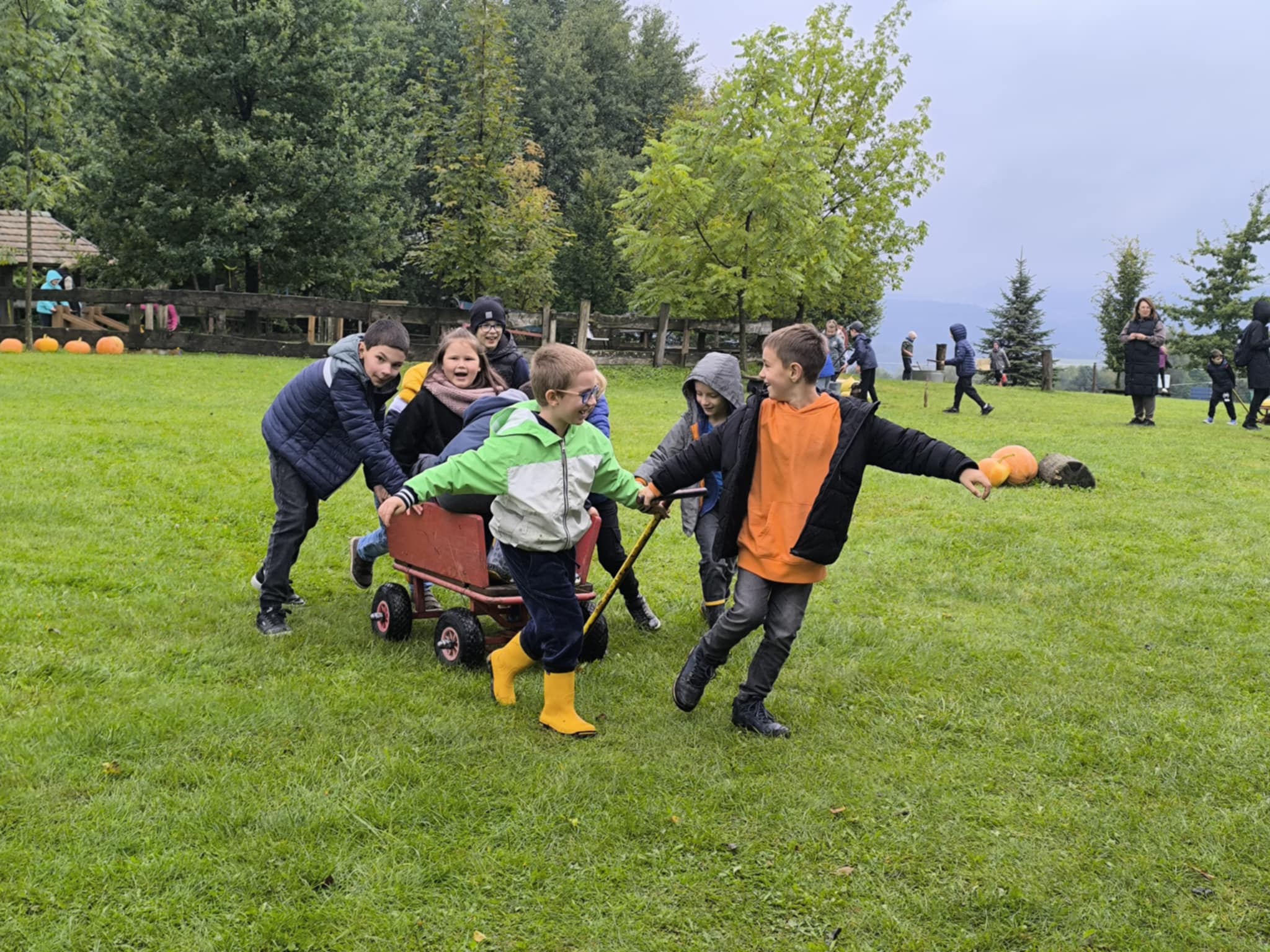 Największym hitem okazało się kiszenie kapusty. Każdy pierwszak wrócił do domu z własnym słoiczkiem – pamiątką i dowodem, że w życiu warto umieć coś więcej niż tylko włączyć komputer. Była też jazda taczkami i drewnianymi wózkami, łowienie rybek z bali i mnóstwo, ale to naprawdę mnóstwo śmiechu. Choć pogoda była kapryśna, dobry humor nie opuszczał nikogo. Dzieci wróciły brudne, ale szczęśliwe – czyli dokładnie takie, jakie powinny być po udanej wycieczce.