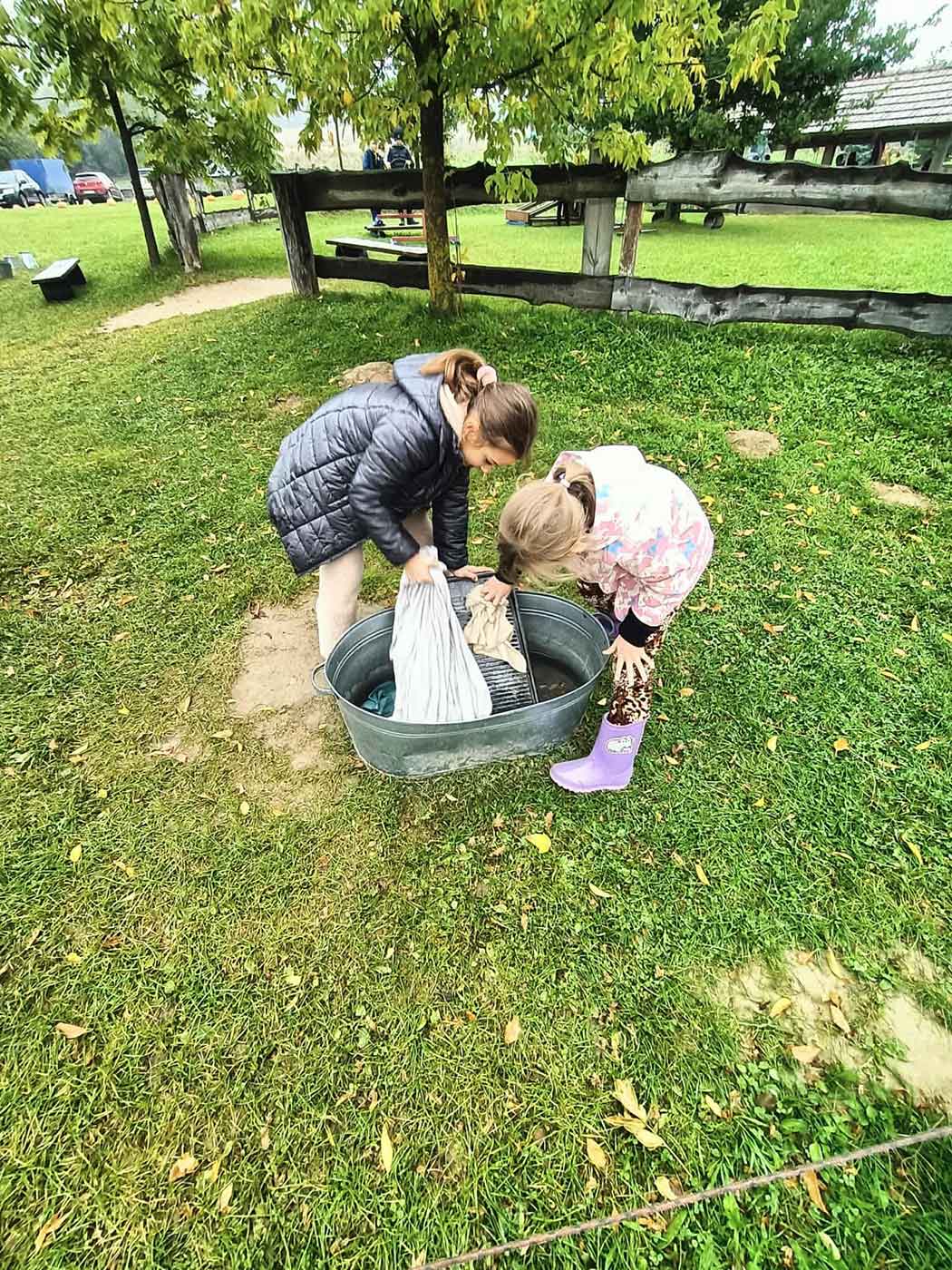Od pierwszych chwil dzieci zanurzyły się w wiejski klimat – były konie, bryczka, zagroda pełna zwierząt i atrakcje, które można by spokojnie nazwać „szkołą życia na wesoło”. Mali podróżnicy mogli spróbować sił jako praczki, mleczarze (ze sztuczną krową, co ważne!), kucharze w błotnej kuchni, a nawet… ogrodnicy, tocząc ogromne dynie po polu.