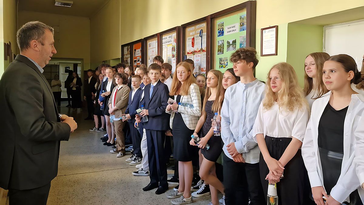 Na korytarzu szkolnym, o godzinie 8:30 Dyrekcja naszej placówki przywitała wszystkich ósmoklasistów, życzyła im powodzenia, odwagi i wiary we własne możliwości podczas pisania pierwszego, tak poważnego testu. Nastroje wśród uczniów były różne. Niektórzy odczuwali lekki stres, inni z kolei podchodzili do edukacyjnego wyzwania z uśmiechem na twarzy. Egzamin rozpoczął się punktualnie o godzinie 9:00. W najbliższą środę będzie sprawdzona wiedza uczniów z matematyki, a w czwartek z języka obcego.