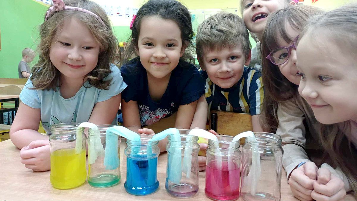 Otóż woda pełni kluczowe funkcje dla życia i rozwoju organizmów. Dlatego dzisiaj na zajęciach rozwijających mali badacze próbowali odpowiedzieć na wszystkie pytania. "Wędrująca woda" to eksperyment, który wymaga czasu i cierpliwości, a na efekt końcowy trzeba trochę poczekać. Doświadczenie obrazuje wędrówkę wody, jaka ma miejsce w roślinach. Oprócz tego to świetne doświadczenie dla dzieci z uzyskaniem nowych kolorów z barw podstawowych. Do zabawy przygotowaliśmy 6 słoików podobnej wielkości. Do 1, 3 i 5 naczynia wlaliśmy tyle samo wody i zabarwiliśmy barwnikiem. Następnie włożyliśmy złożone w paski papierowe ręczniki. Eksperyment w sumie trwał kilka godzin. Pierwsze reakcje, czyli barwienie się i zwilżenie papierowych ręczników zauważyliśmy dosyć szybko. Po około godzenie zaobserwowaliśmy, iż w pustym słoiku pojawiła się woda, wypełniona kolorem powstałym z połączenia obu użytych oddzielnych barw. Powstałe zjawisko bardzo podobało się dzieciom.