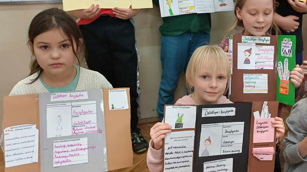 Uczniowie klasy drugiej w ramach omawiania lektury Grzegorza Kasdepki pt. „Detektyw Pozytywka” zabrali się do prac detektywistycznych. Początkowo w oparciu o prezentację Wordwall poznali autora książki. Następnie dowiedzieli się szczegółów na temat pracy detektywa oraz samodzielnie pobierali odciski palców, obserwując ich linie papilarne za pomocą lupy. Kolejnym zadaniem było wykonanie metryczki do książki i wyłonienie jej bohaterów oraz ich cechy charakteru w oparciu o krzyżówki, quizy, karty z kodowaniem. Dalszym działaniem było wykonanie pracy plastycznej - lapbooka. Zadanie to przyniosło dzieciom wiele pozytywnych emocji, bo dzięki niemu uczniowie utrwalali i rozszerzali swoja wiedzę na temat książki, a przy tym mogli wykazać się swoją kreatywnością, pomysłowością, bogatą fantazją, ciekawym sposobem na zaprezentowanie lektury. Dużo emocji wywołało również opowiadanie przygód Pozytywki i mieszkańców jego kamienicy. Podsumowaniem naszych działań był test wyboru na temat zdobytych wiadomości z lektury. Praca z tą książką była dla uczniów bardzo ciekawa, pozwoliła dzieciom na pełną działalność twórczą oraz dostarczyła wielu pozytywnych wrażeń ze wspólnej pracy. Uczniowie z ogromnym zapałem czekają już na kolejną zabawę lekturą.