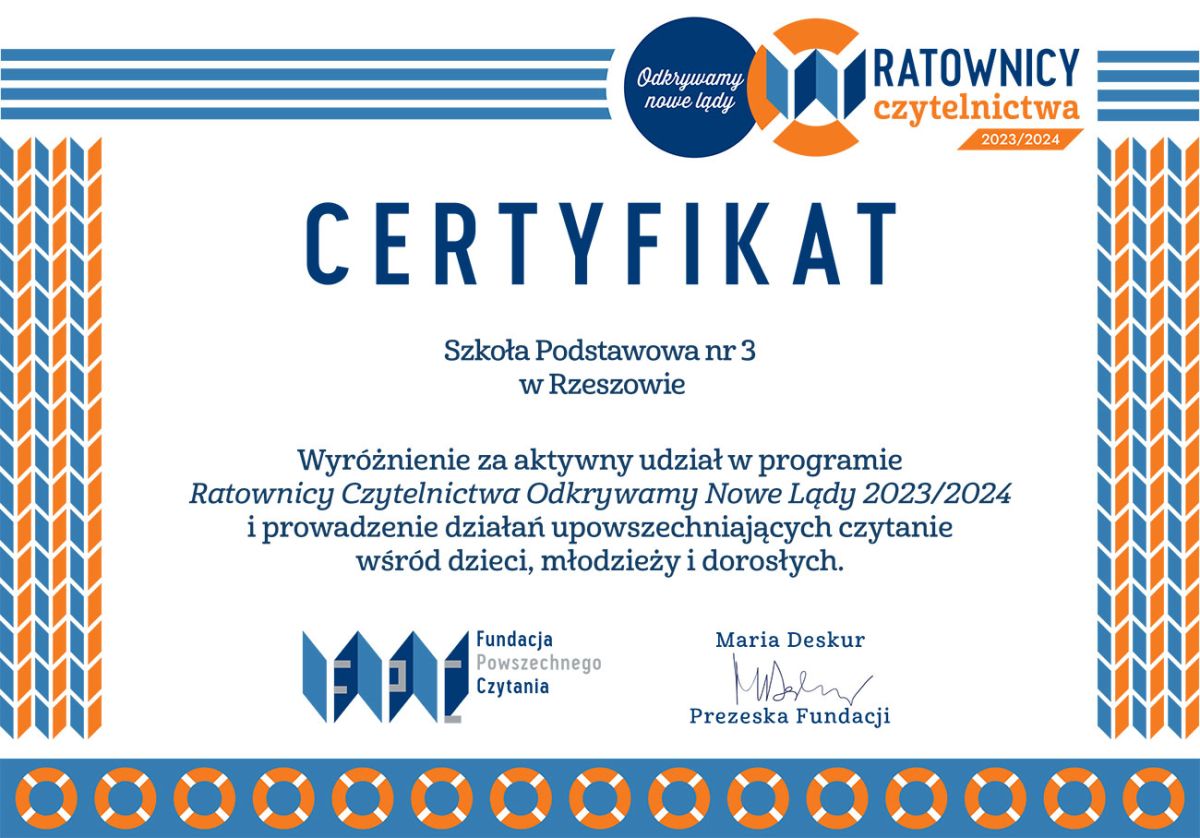 Ratownicy czytelnictwa - mamy certyfikat za rok szk. 2023/2024