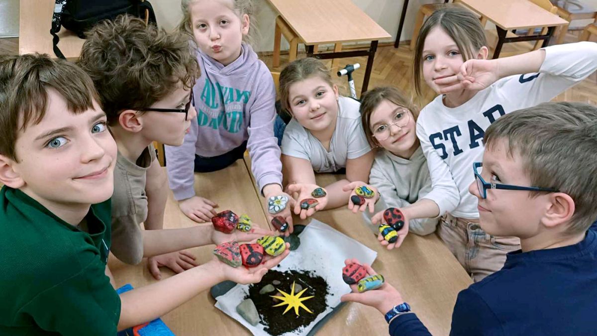 Przyrodnicy poszerzali swoją wiedzę w oparciu o karty pracy, prezentację a także żywe okazy przyrody. Podsumowaniem ich działań była zabawa plastyczna z przyrodą nieożywioną tj. kamieniami. Uczniowie wykonali z nich piękne owady oraz kwiat. Dzięki kreatywności naszych przyrodników, udało się z szarych kamieni wyczarować prawdziwe dzieła sztuki - biedronki, pszczółki, a nawet małą stokrotkę.