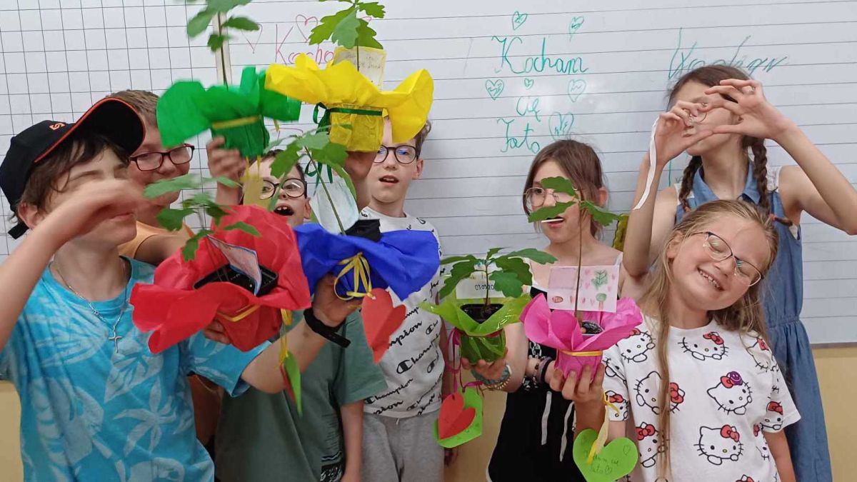 Tego dnia dzieci przygotowały również nietypowy prezent z okazji Dnia Taty – własnoręcznie wyhodowane sadzonki dębu. Jesienią, podczas wcześniejszych zajęć, uczniowie samodzielnie posadzili żołędzie, a przez kolejne miesiące z troską pielęgnowali i obserwowały młode roślinki. Teraz, kiedy sadzonki stały się już małymi drzewkami, nadszedł czas, by przekazać je w ręce wyjątkowych osób – Tatusiów. Dąb, to symbol siły, wytrwałości i wielkości, został wybrany nieprzypadkowo. Ma on przypominać każdemu Tacie, jak ważną i niezastąpioną rolę odgrywa w życiu swojego dziecka. Dzieci samodzielnie ozdobiły swoje sadzonki dekoracyjnym papierem i piękną wstążką oraz osobistym wpisem – pełnym miłości i wdzięczności. Tego dnia każdy Uczeń otrzymał zachętę, aby wraz z Tatą posadzić dąb w szczególnym miejscu – w przydomowym ogródku, na działce lub w innym wyjątkowym zakątku, który wspólnie wybiorą. Ten moment sadzenia jest symbolem rosnącej relacji, opartej na miłości, zaufaniu i wspólnym czasie. Tym gestem uczniowie pokazali, jak bardzo kochają swoich Tatusiów i jak wiele Oni dla nich znaczą. Niech każda sadzonka wzrasta w siłę – tak jak więź między dzieckiem a jego Tatą.