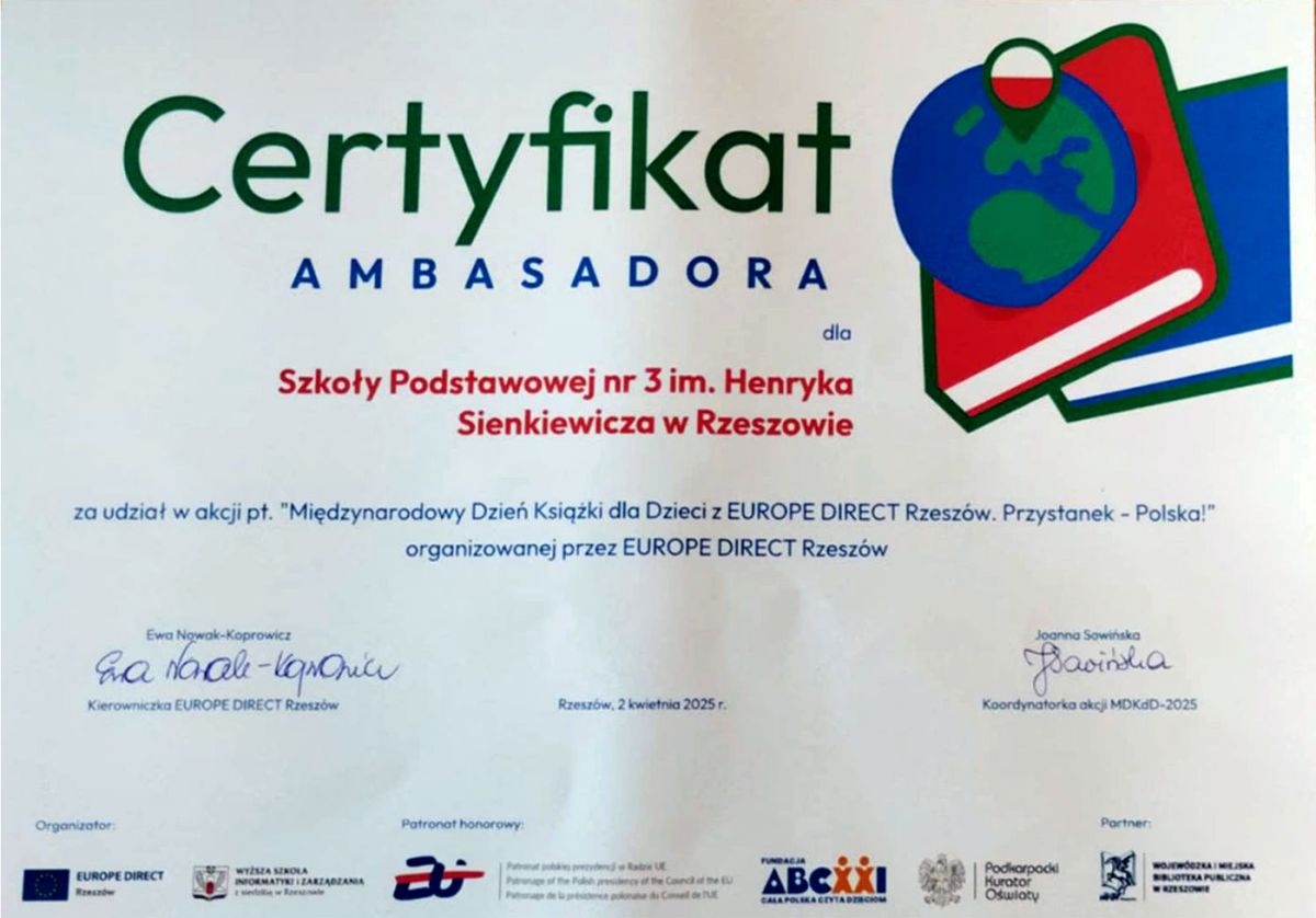 Z dumą informujemy, że nasza szkoła została uhonorowana Certyfikatem Ambasadora za udział w akcji pt. "Międzynarodowy Dzień Książki dla Dzieci z EUROPE DIRECT Rzeszów. Przystanek – Polska!".