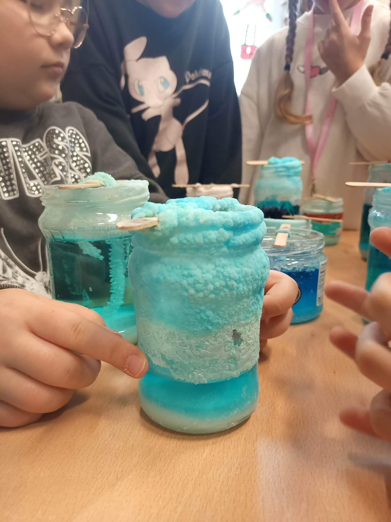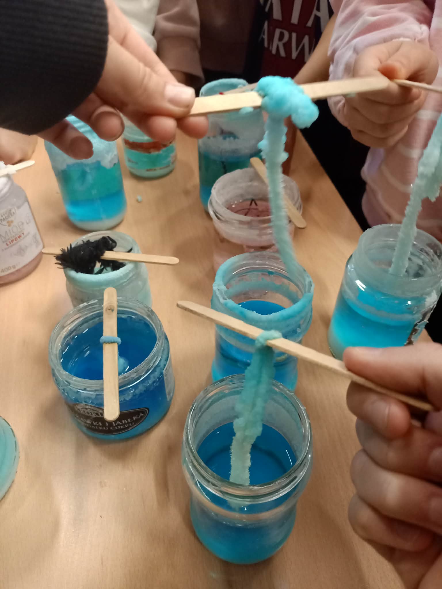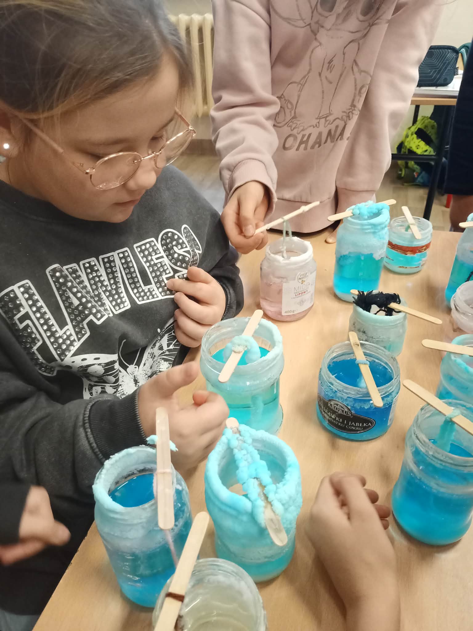 Przez kolejny tydzień uczniowie codziennie obserwowali, jak woda powoli odparowuje, a na nitkach zaczynają tworzyć się pierwsze kolorowe kryształki. Z każdym dniem stawały się one większe, wyraźniejsze i coraz intensywniej zabarwione. Dzieci zauważyły też, że różne kolory dają różne efekty i chętnie porównywały swoje słoiki.