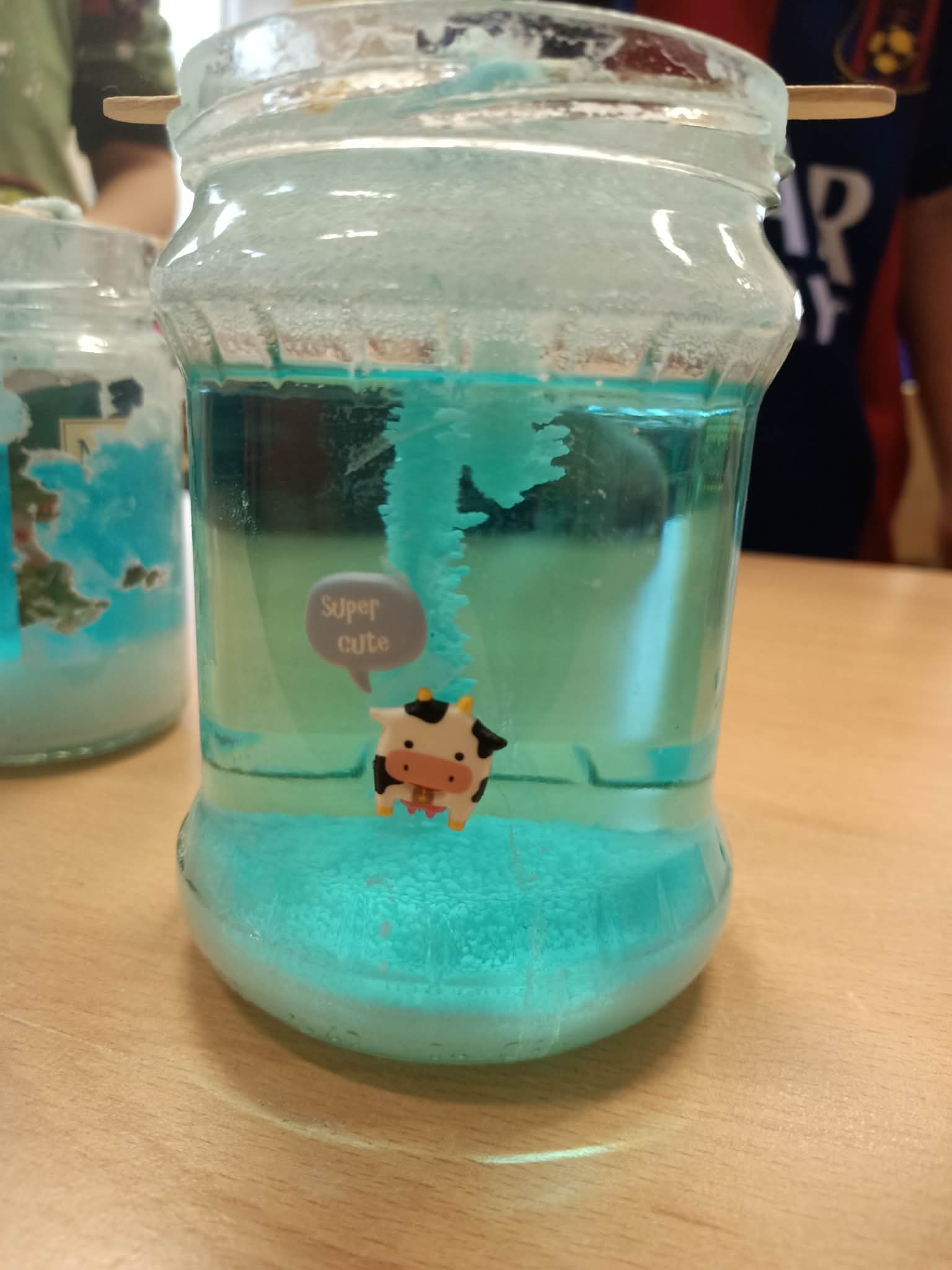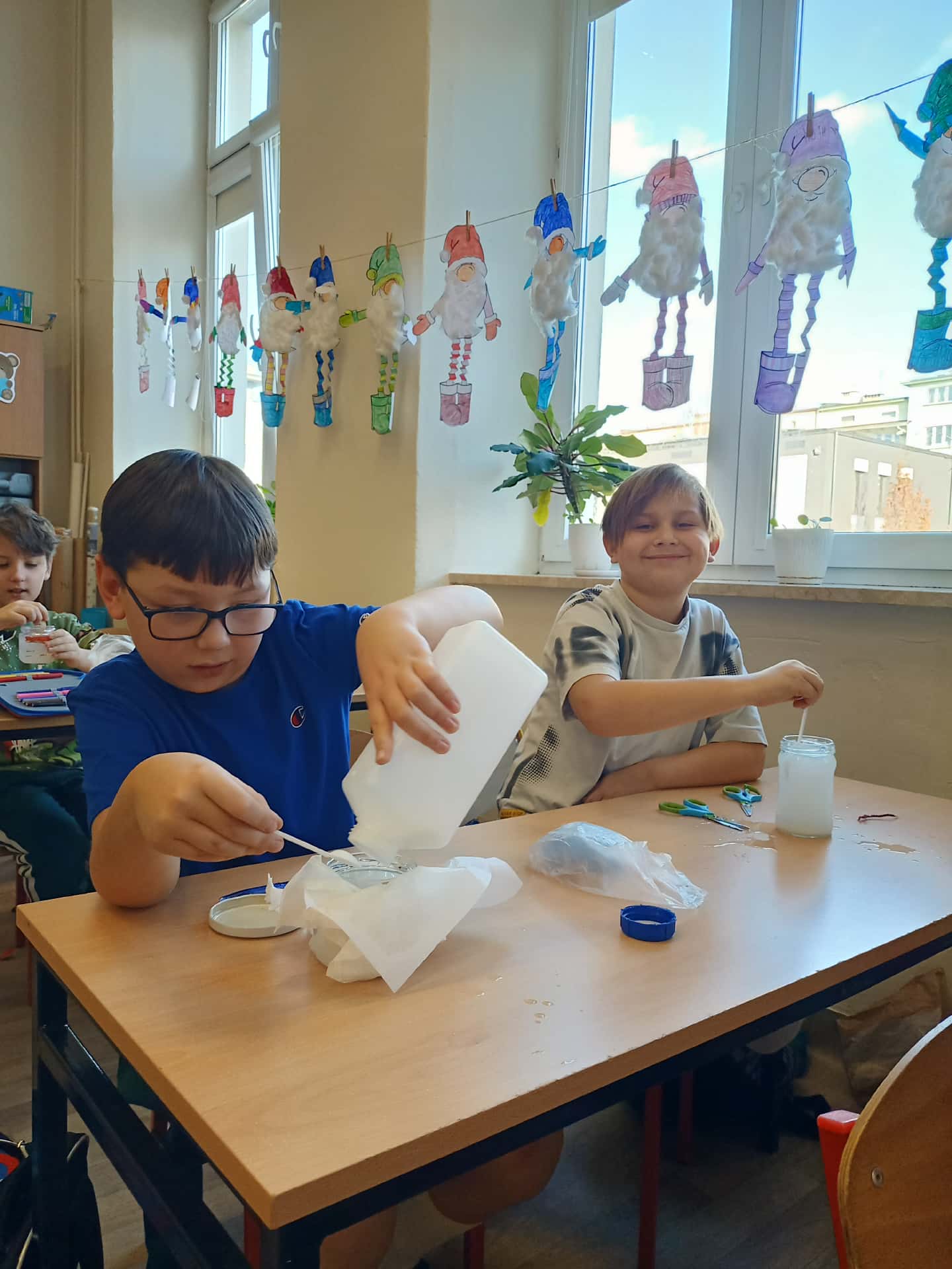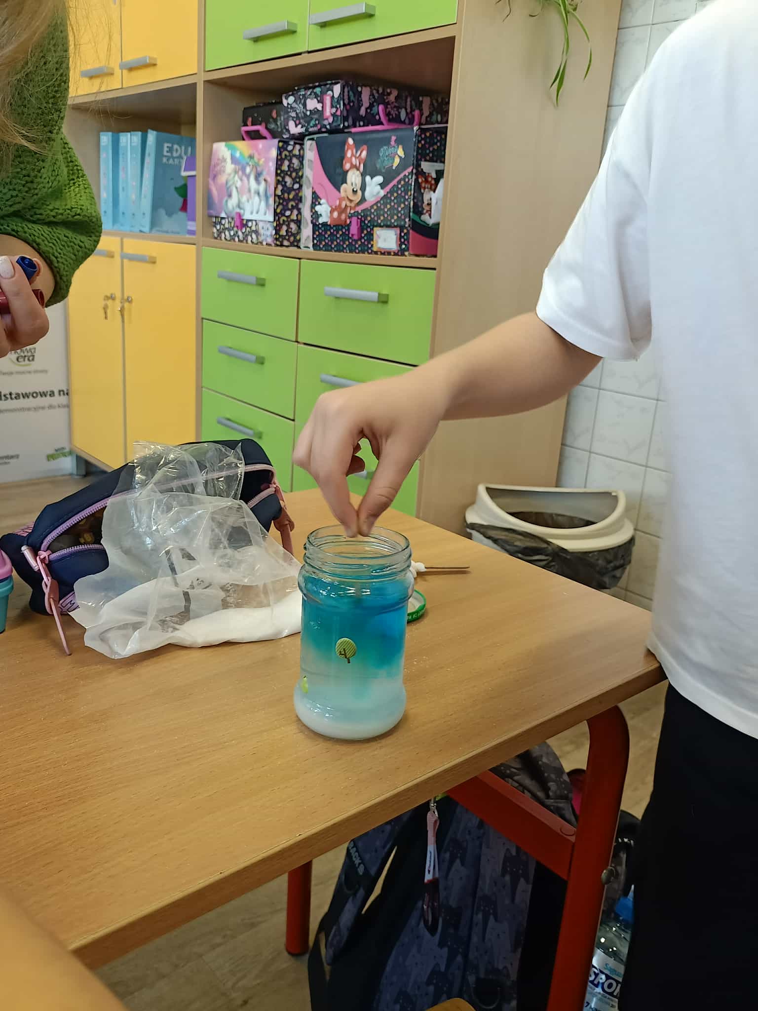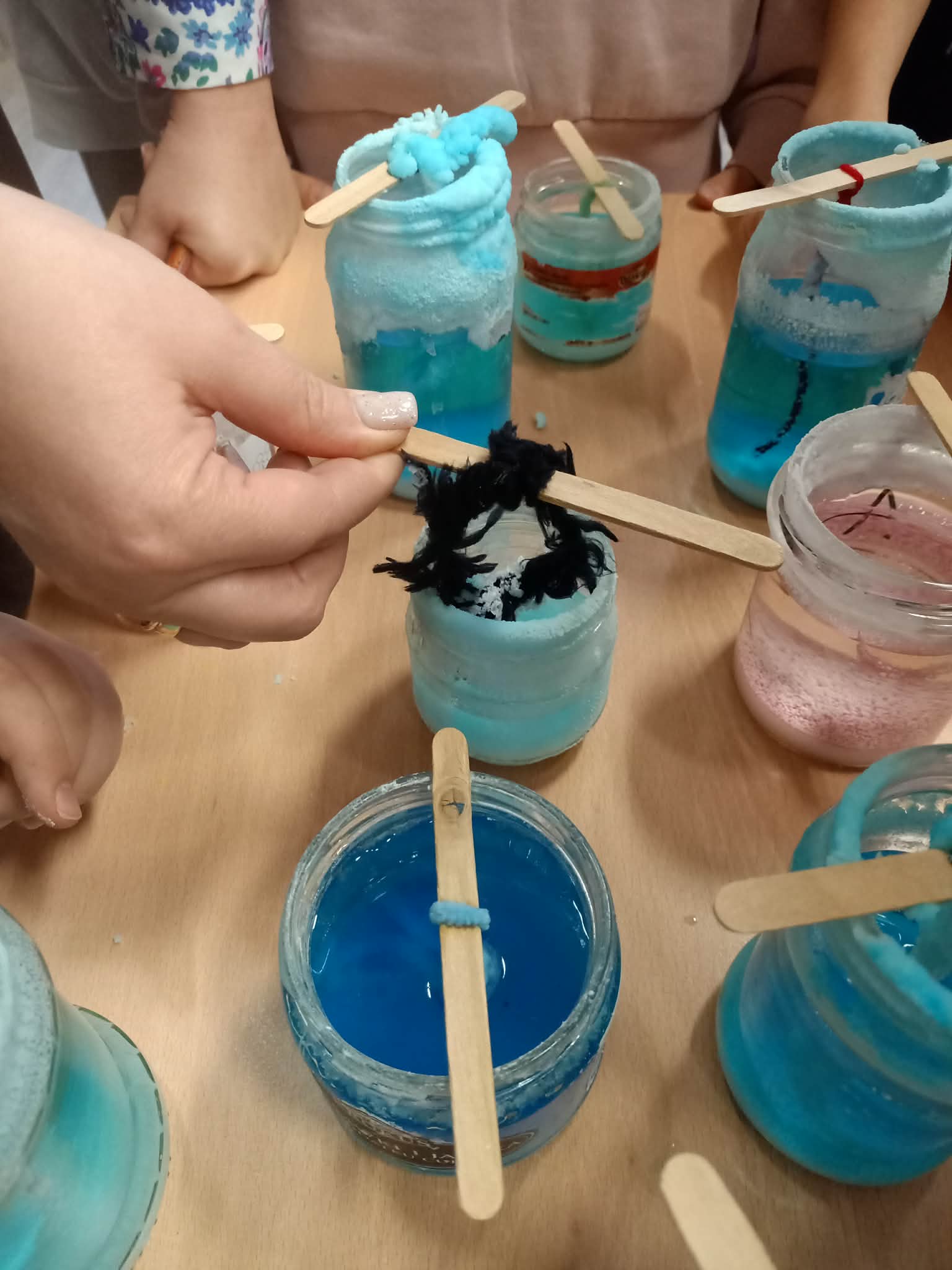 Przez kolejny tydzień uczniowie codziennie obserwowali, jak woda powoli odparowuje, a na nitkach zaczynają tworzyć się pierwsze kolorowe kryształki. Z każdym dniem stawały się one większe, wyraźniejsze i coraz intensywniej zabarwione. Dzieci zauważyły też, że różne kolory dają różne efekty i chętnie porównywały swoje słoiki.