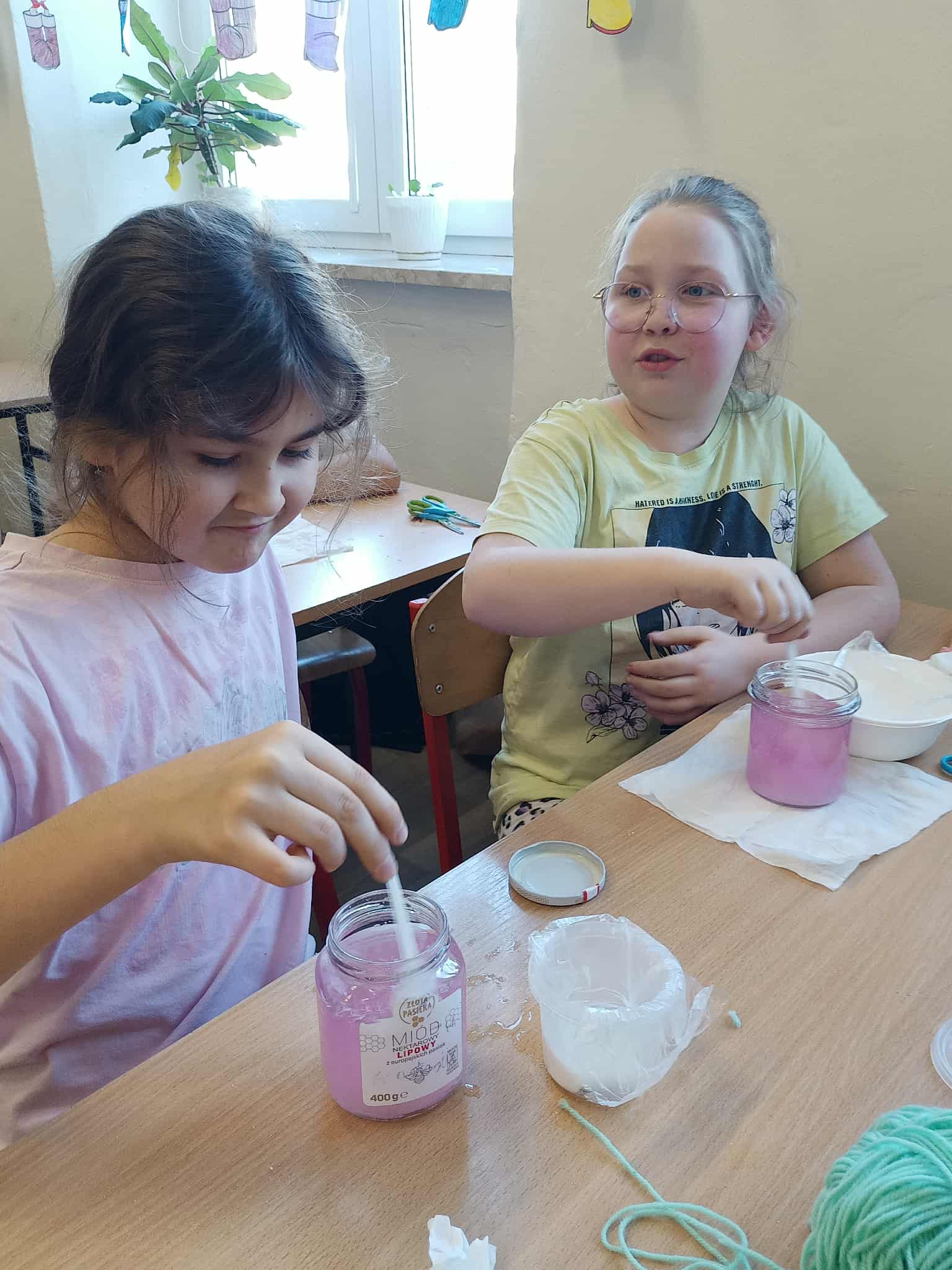 W klasie 3b przeprowadziliśmy doświadczenie polegające na założeniu hodowli kryształków soli. Na początku przygotowaliśmy nasycony roztwór soli, rozpuszczając ją w ciepłej wodzie aż do momentu, gdy przestała się rozpuszczać. Aby uzyskać ciekawszy efekt, do roztworu dodaliśmy barwniki spożywcze w różnych kolorach. Następnie roztwory przelaliśmy do słoików, a nad nimi zawiesiliśmy nitki na patyczkach od lodów.