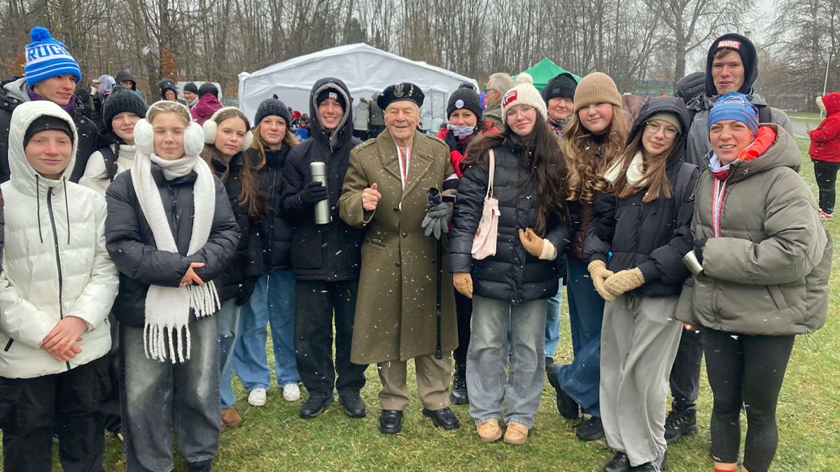Biegaczom było chłodno, ale wolontariuszom baarrdzo chłodno i wietrznie. Jednak bez nich ani rusz. Nasi wspaniali uczniowie bez względu na pogodę są zawsze tam, gdzie potrzeba pomocy. Dziękujemy im za to. Wolontariusze zabezpieczali trasę biegu oraz wręczali medale. Swoją obecnością zaszczycili nas Kombatanci Armii Krajowej (ponad 100 -letni). Jesteśmy dumni, że mogliśmy tam być, to była żywa lekcja historii.