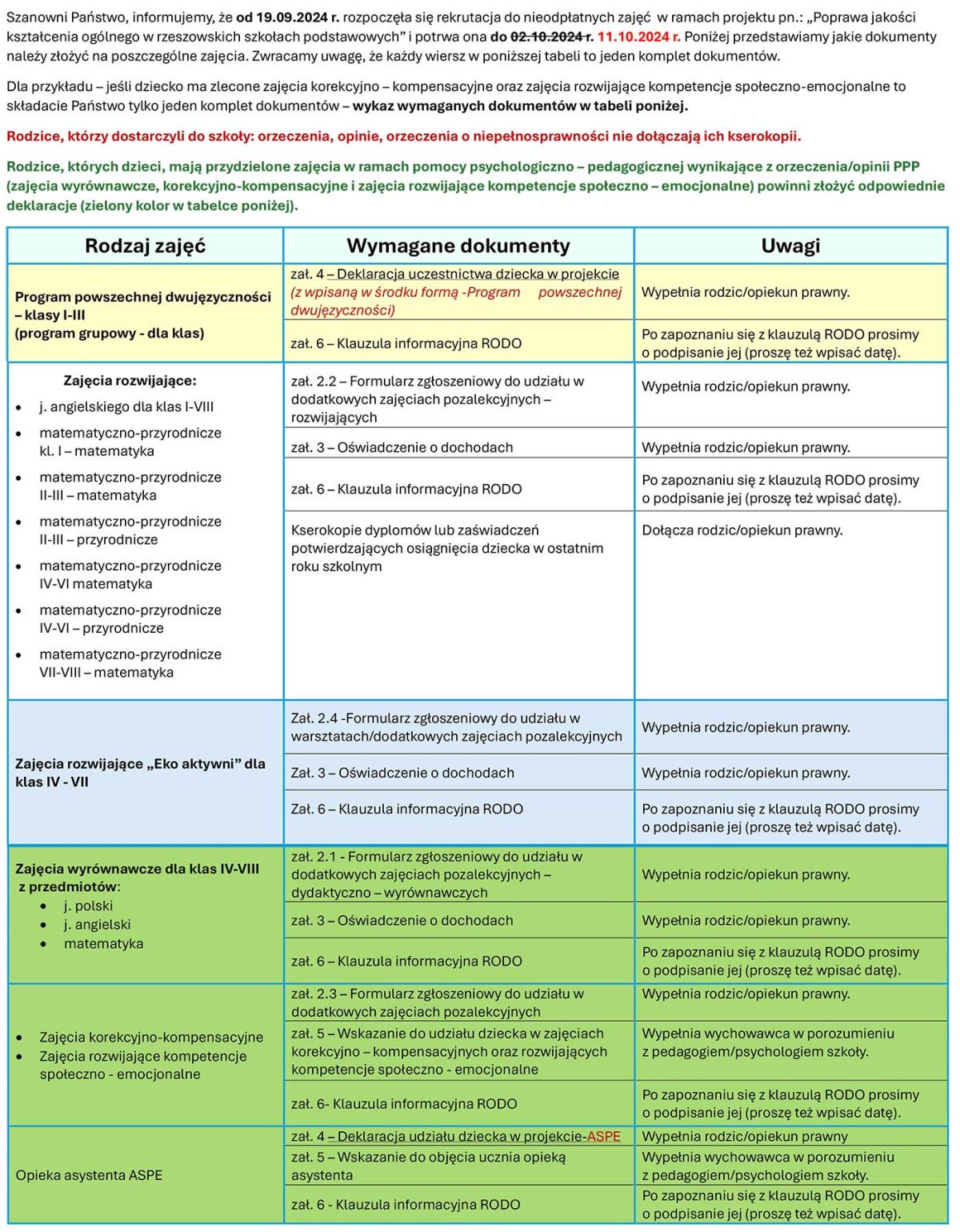 Dokumenty wymagane przy zgłaszaniu udziału dziecka w zajęciach projektowych