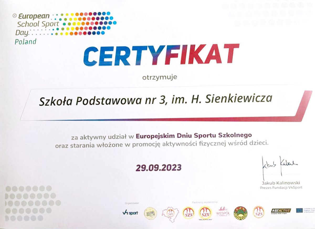 Dzięki temu, że nasi uczniowie z klas 2, 3 i 4 uczestniczyli w Europejskim Dniu Sportu Szkolnego, zostaliśmy docenieni. Szkoła Podstawowa nr 3 otrzymała certyfikat za aktywny udział, a także promocję aktywności fizycznej wśród dzieci. Dziękujemy wszystkim klasom oraz wychowawcom.